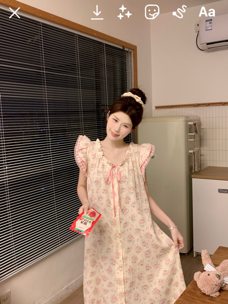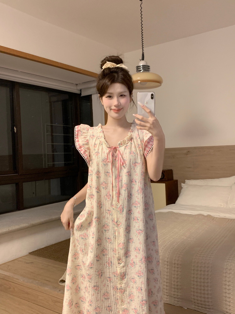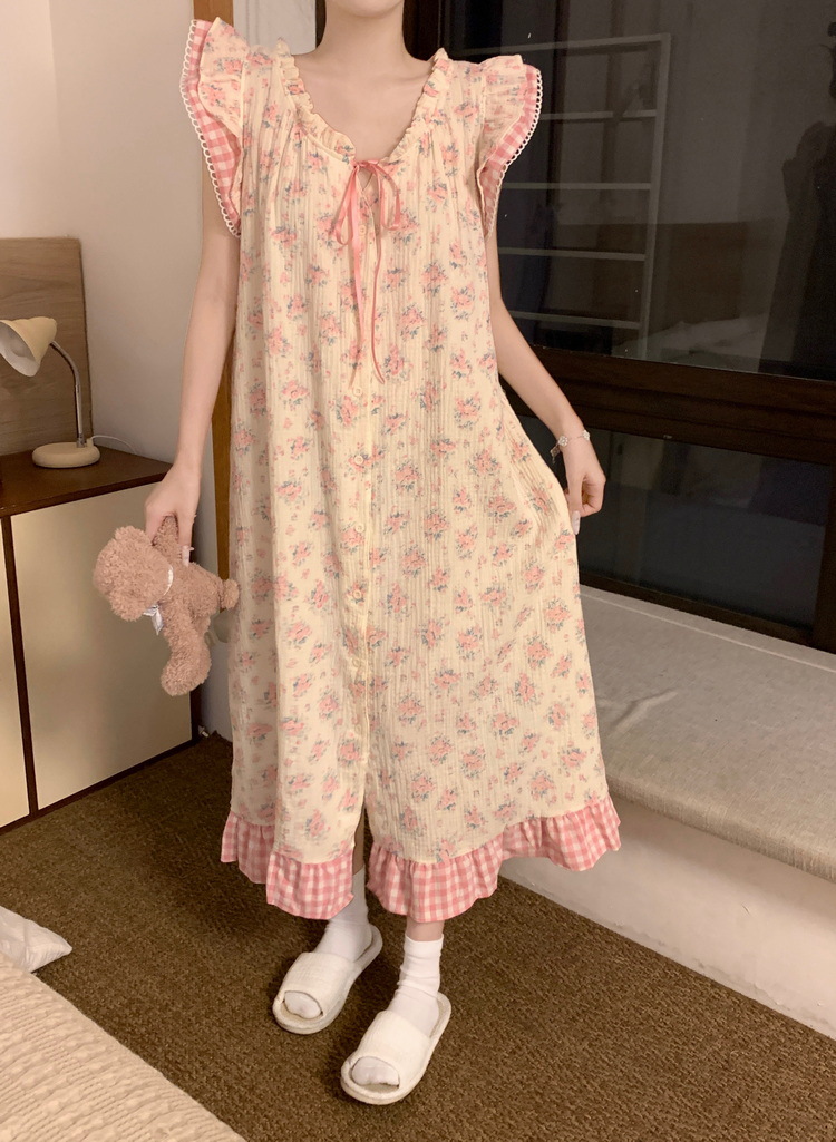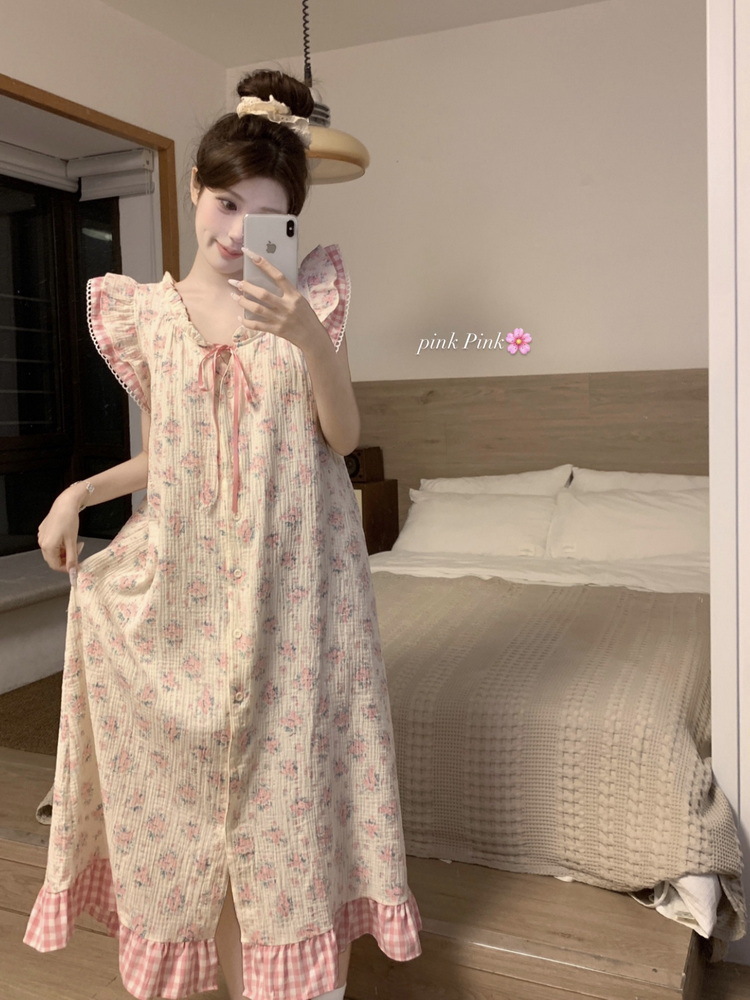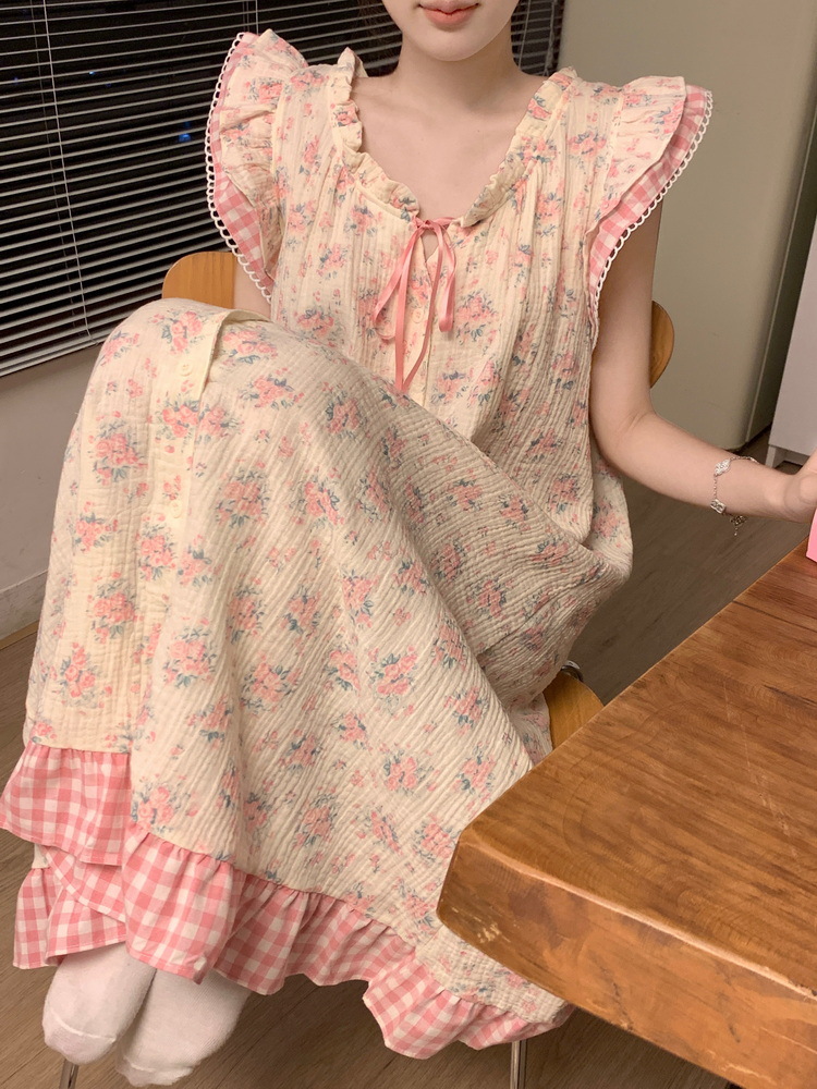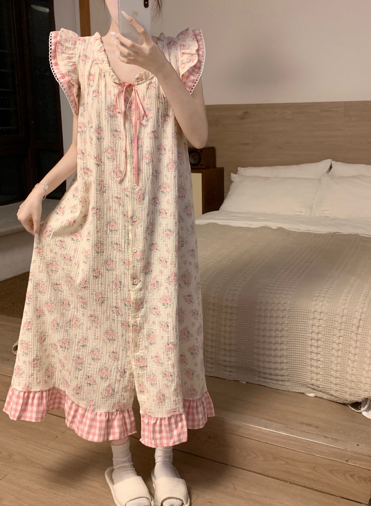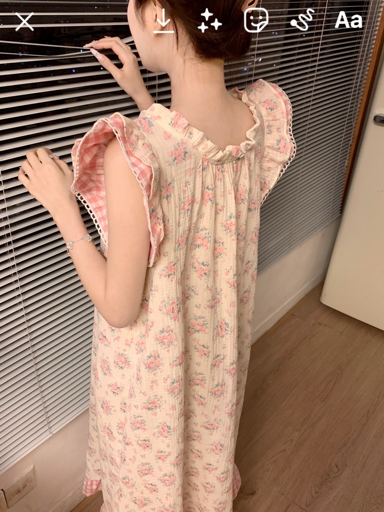 Tags: Japanese nightgown, floral cotton sleepwear, double-layer gauze dress, French loungewear, 2025 women's pajamas, long summer nightdress