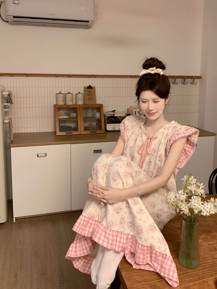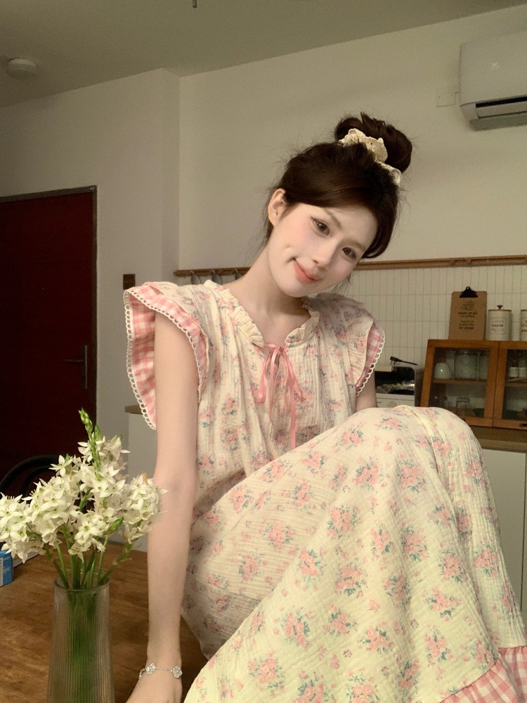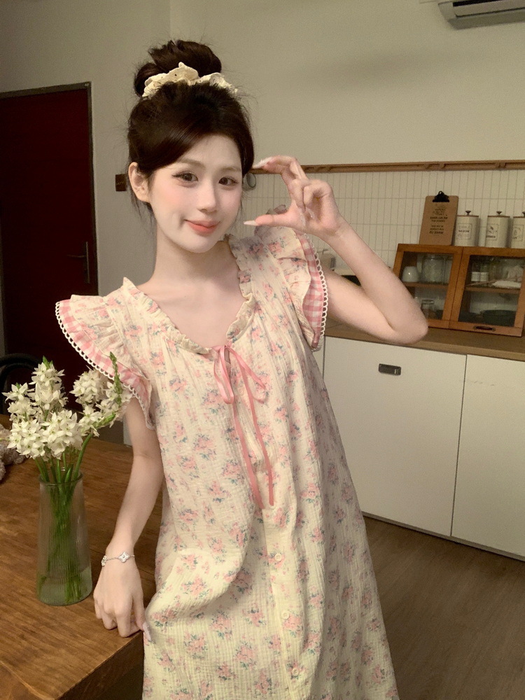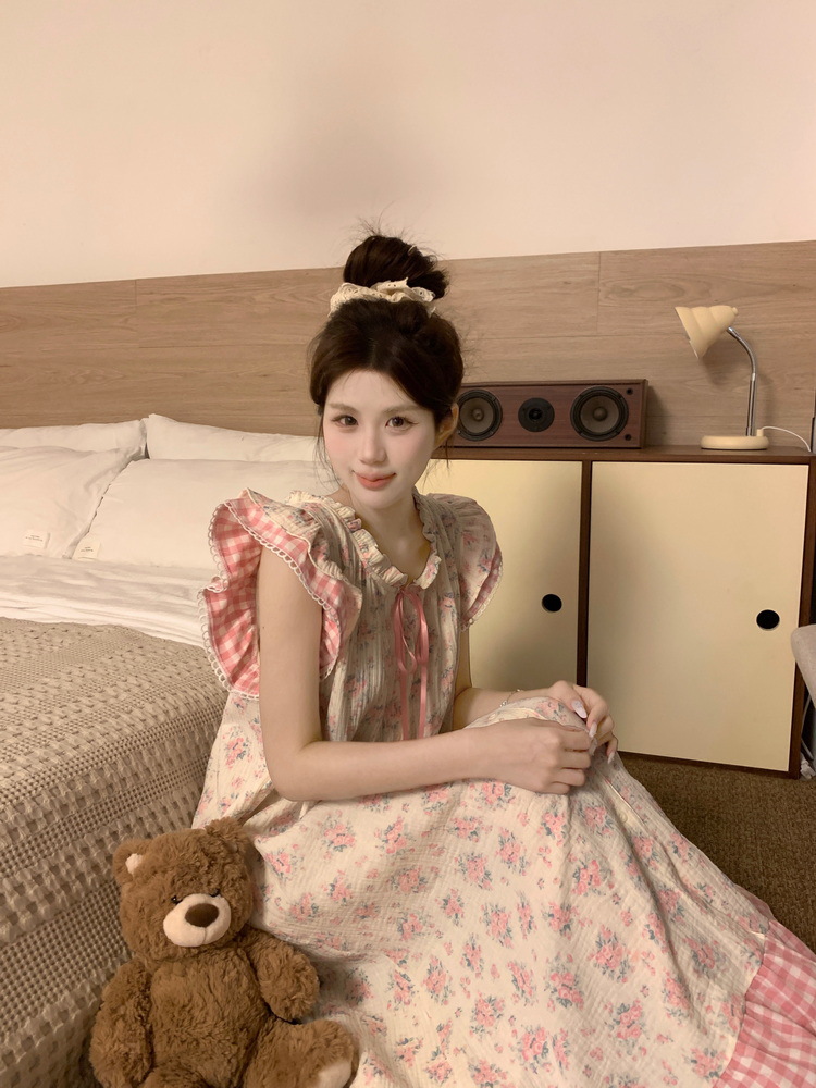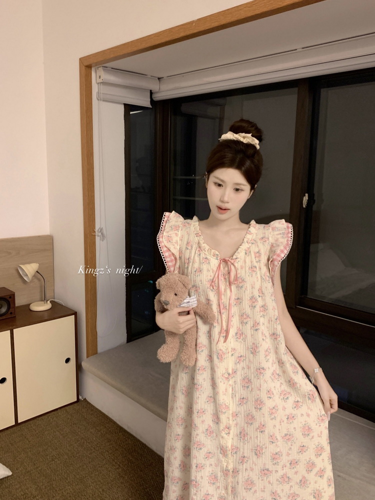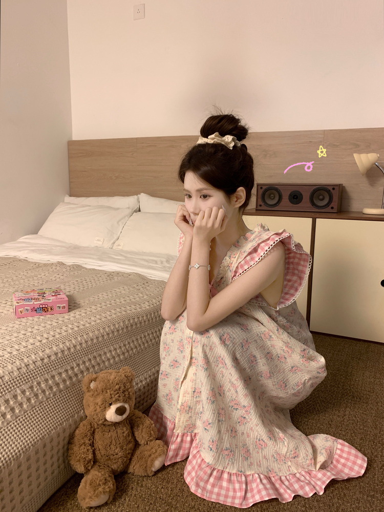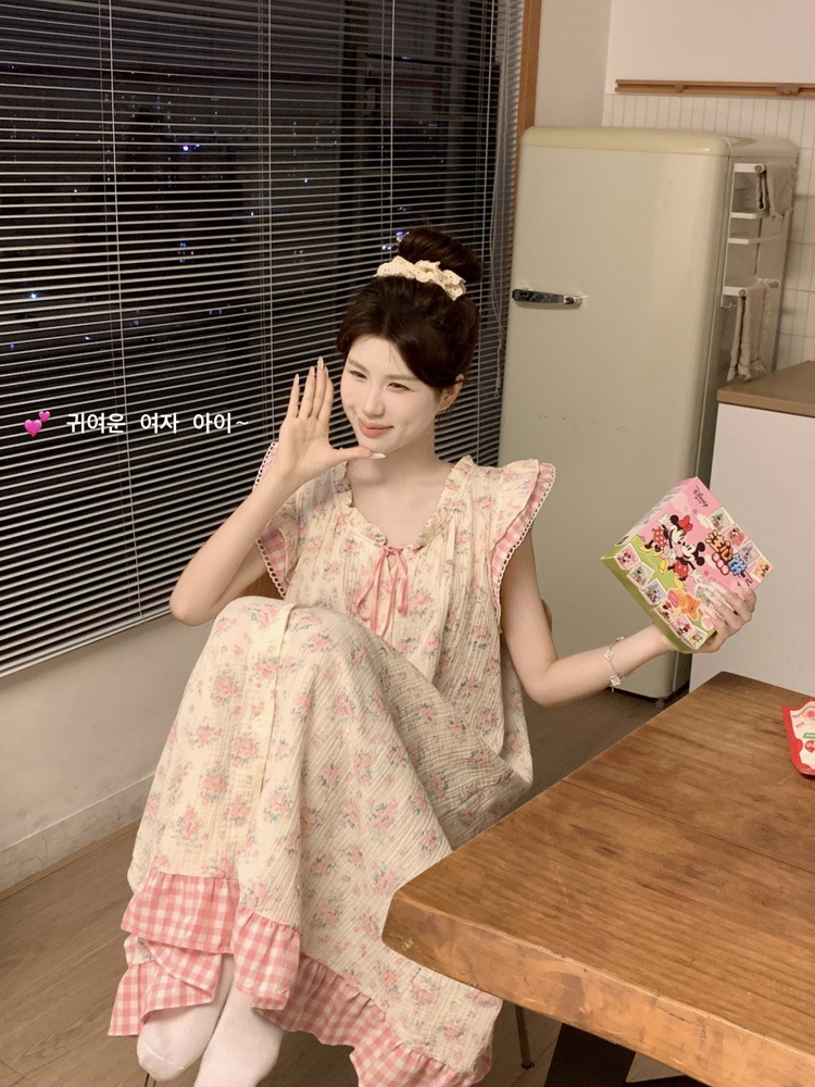 Tags: Japanese nightgown, floral cotton sleepwear, double-layer gauze dress, French loungewear, 2025 women's pajamas, long summer nightdress