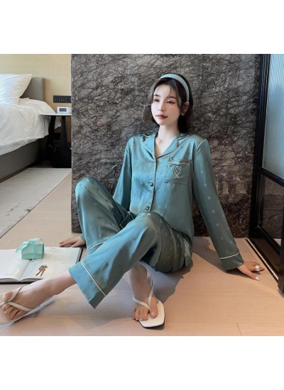 Silk-Like Fashion Love Printing Elegant Long-sleeved Cardigan Pajamas Suit