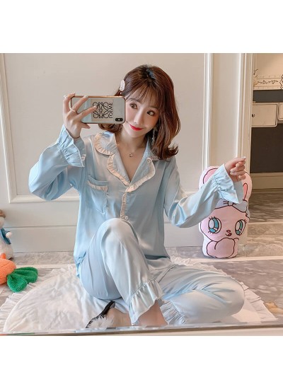Long sleeve princess style sleepwear sweet lovely sexy ice silk two-piece pajama set
