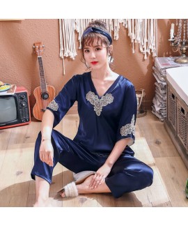 Short Sleeve ice silk Sleepwear FemaleLace Chiffon Stitching pajamas for Spring and Summer