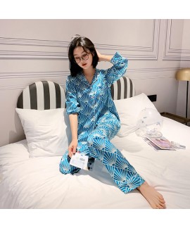 Spring and summer long sleeve silk like Pajama suit ins sexy printed ice silk sleepwear