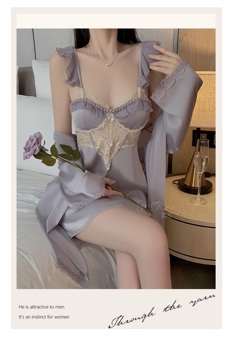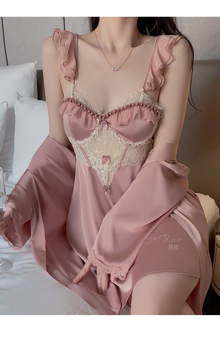 Deep V Low-Cut Chest Pad Sleepwear with Flying Sleeves and Pearls, Backless Strap Nightdress