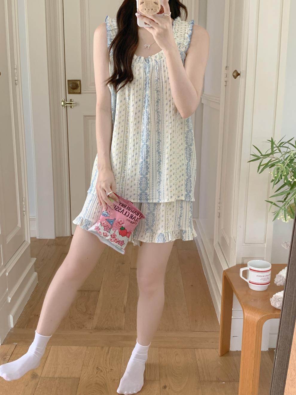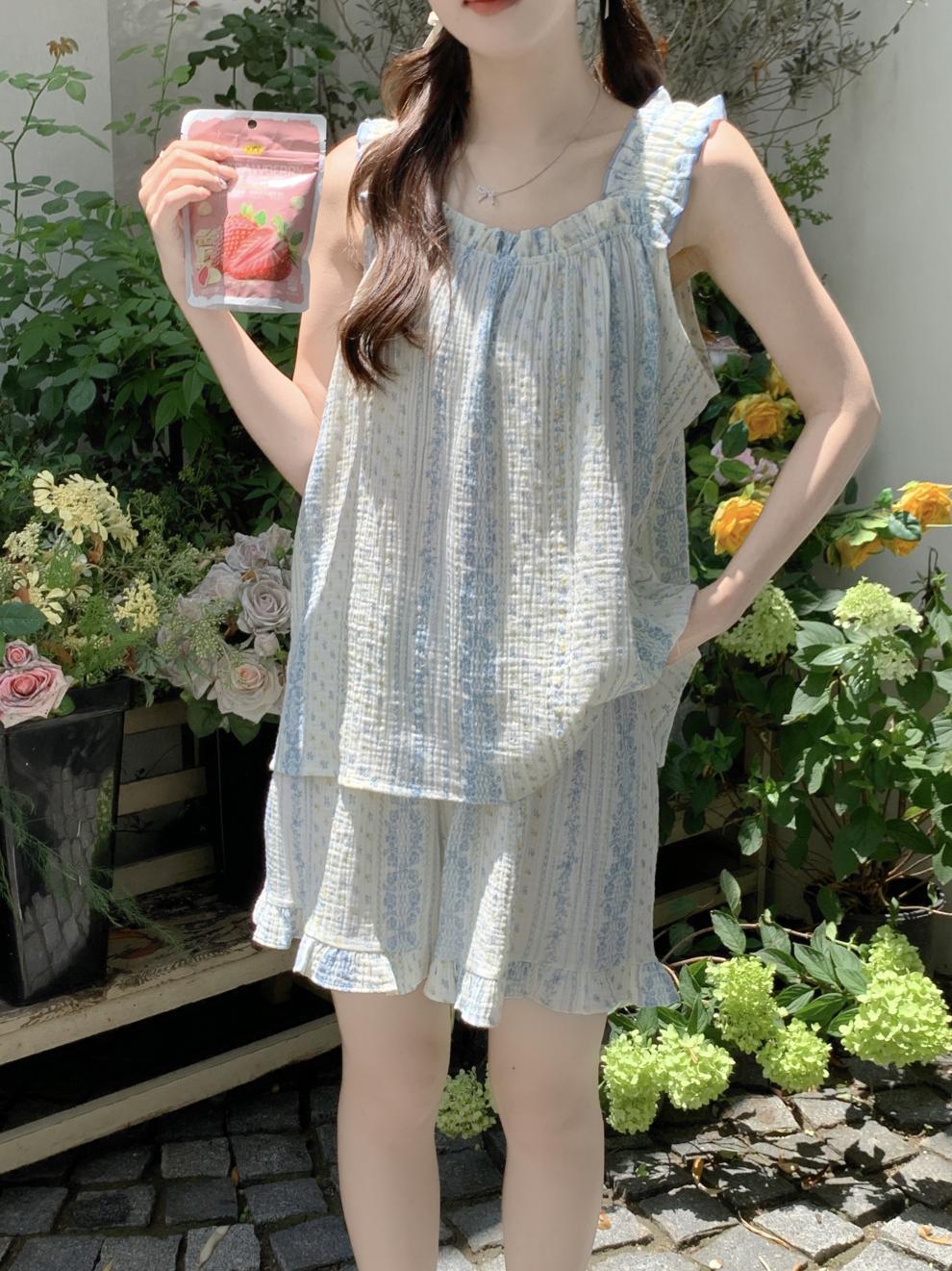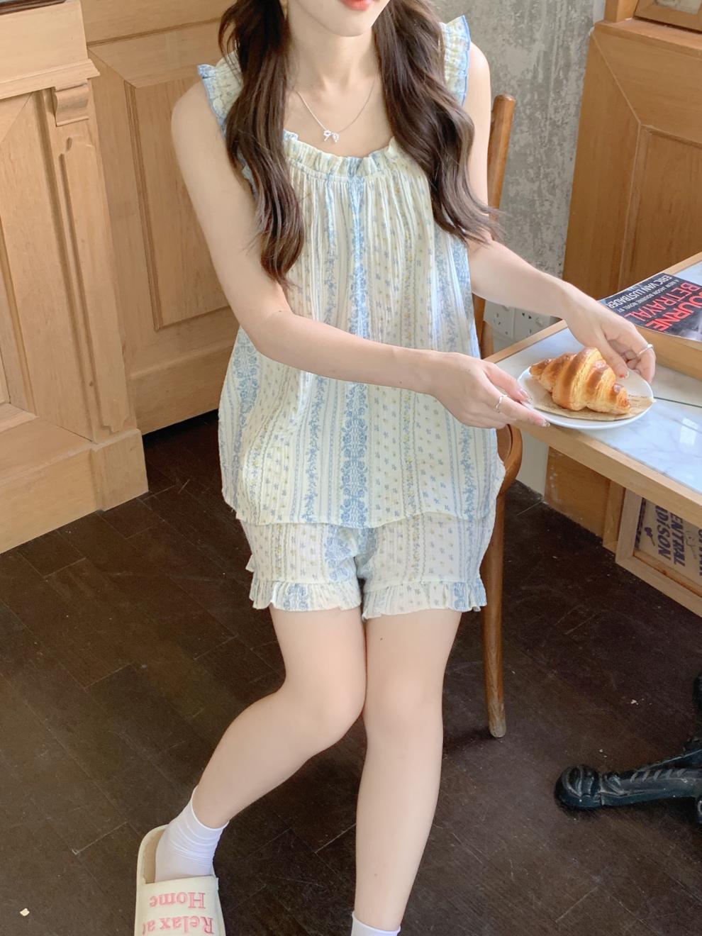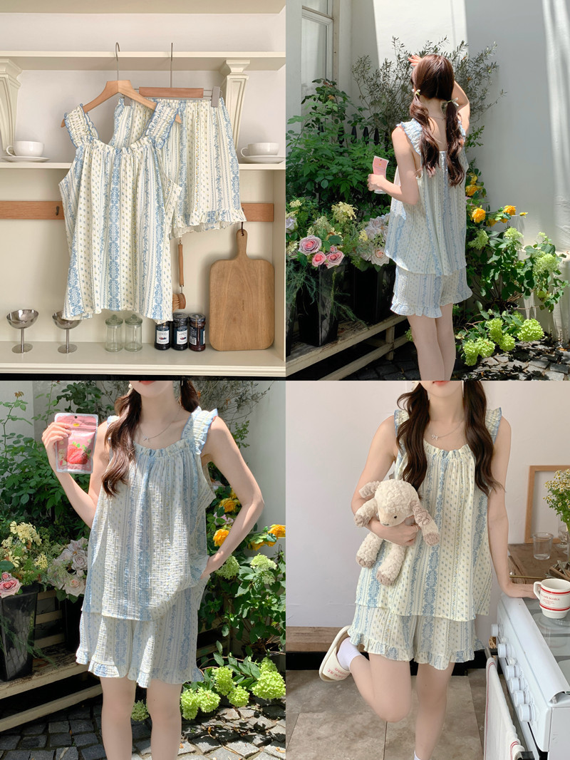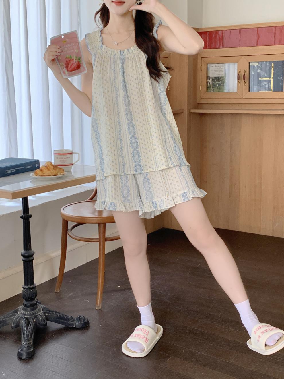 Tags: Korean pajama set, floral sleepwear, summer loungewear, camisole two-piece, 2025 women's pajamas, breathable homewear