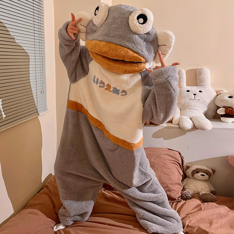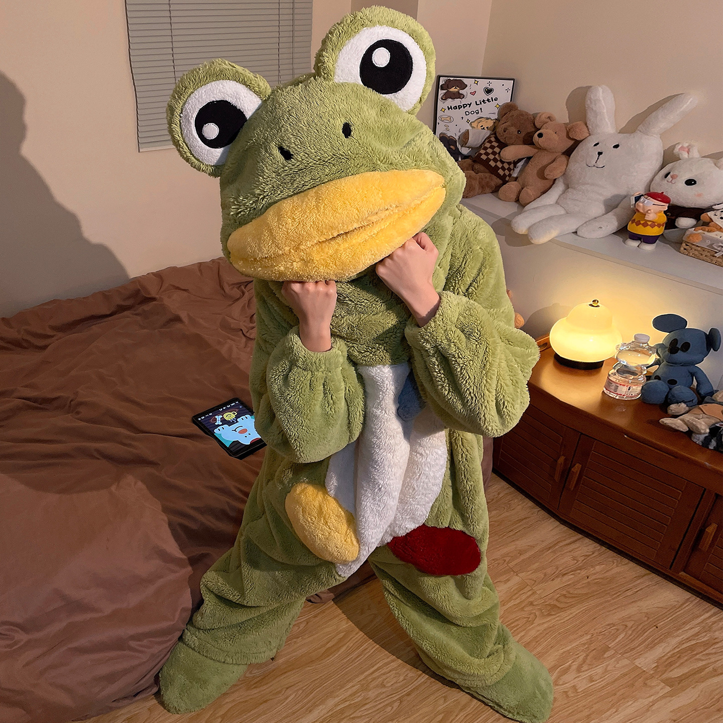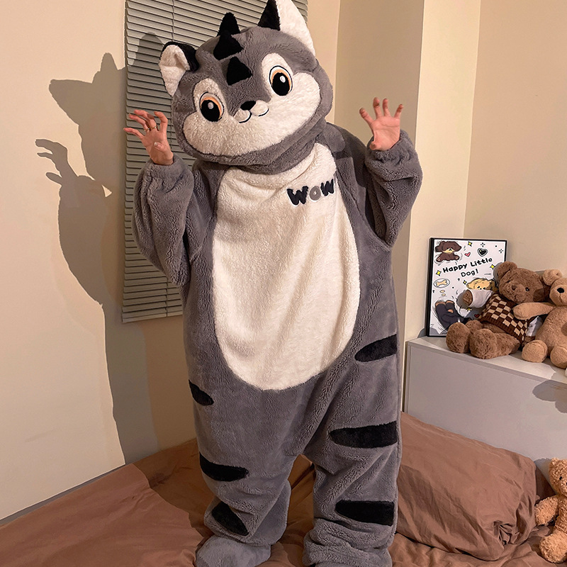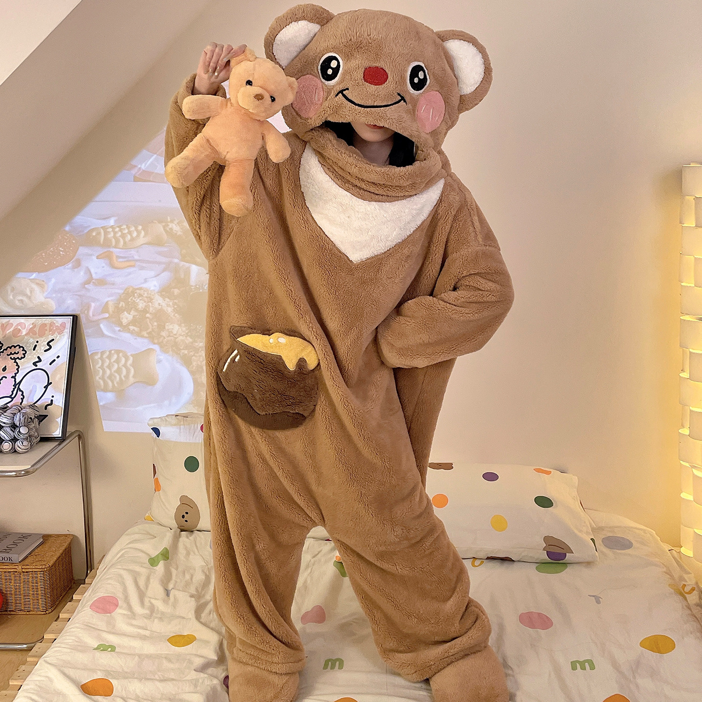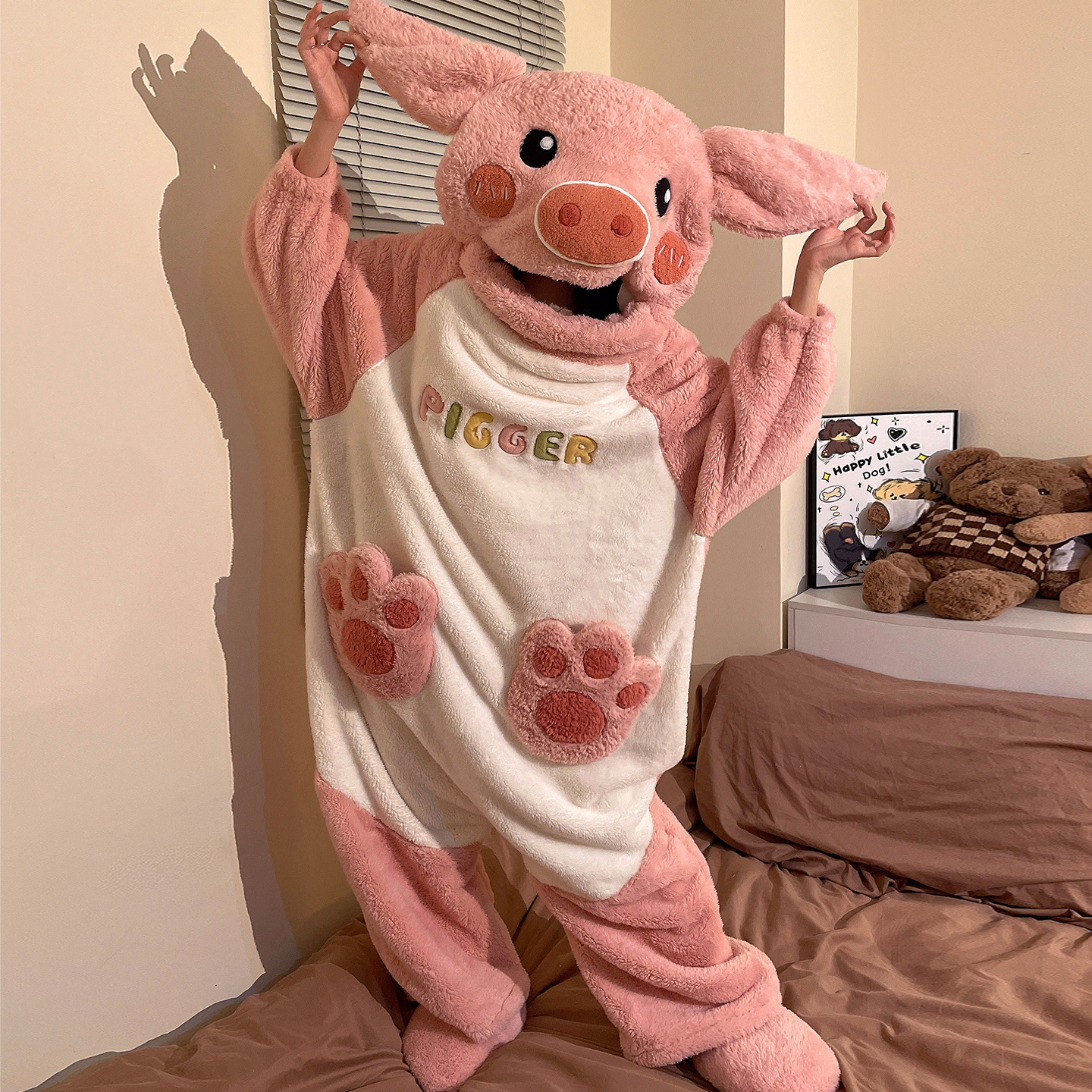 The one-piece jumpsuit design offers full-body coverage with long sleeves and long pants, making it perfect for lounging at home, sleeping, studying in dorms, or even stepping outdoors on chilly days. With a cartoon-style, lazy-fit silhouette, it delivers a fun and relaxed look that suits students and those who love cute, cozy homewear.