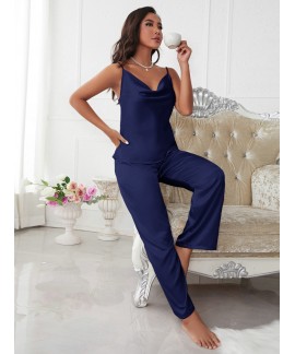 Women's Two-piece Set Silk Satin Cami Tops &Pants Pajama Sets Color : Navy Blue,,,,,,,Size : S(4),M(6),L(8/1..