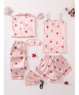 Women's Strawberry Pattern Satin Multi-functional Pajamas Long-sleeved Tops Trousers Vest Shorts Eye Mask Turb..