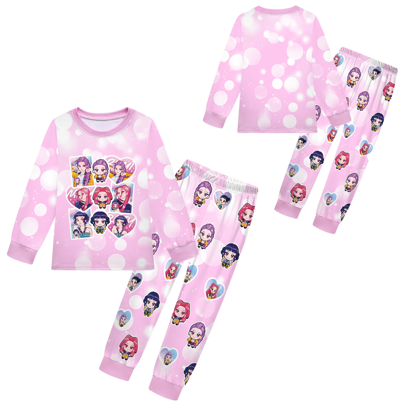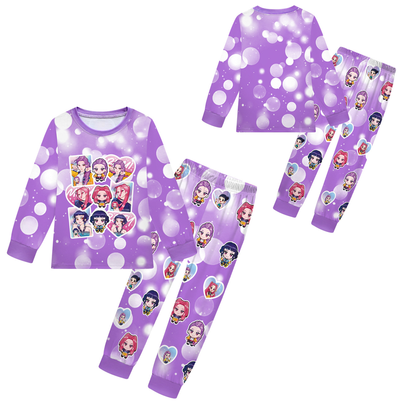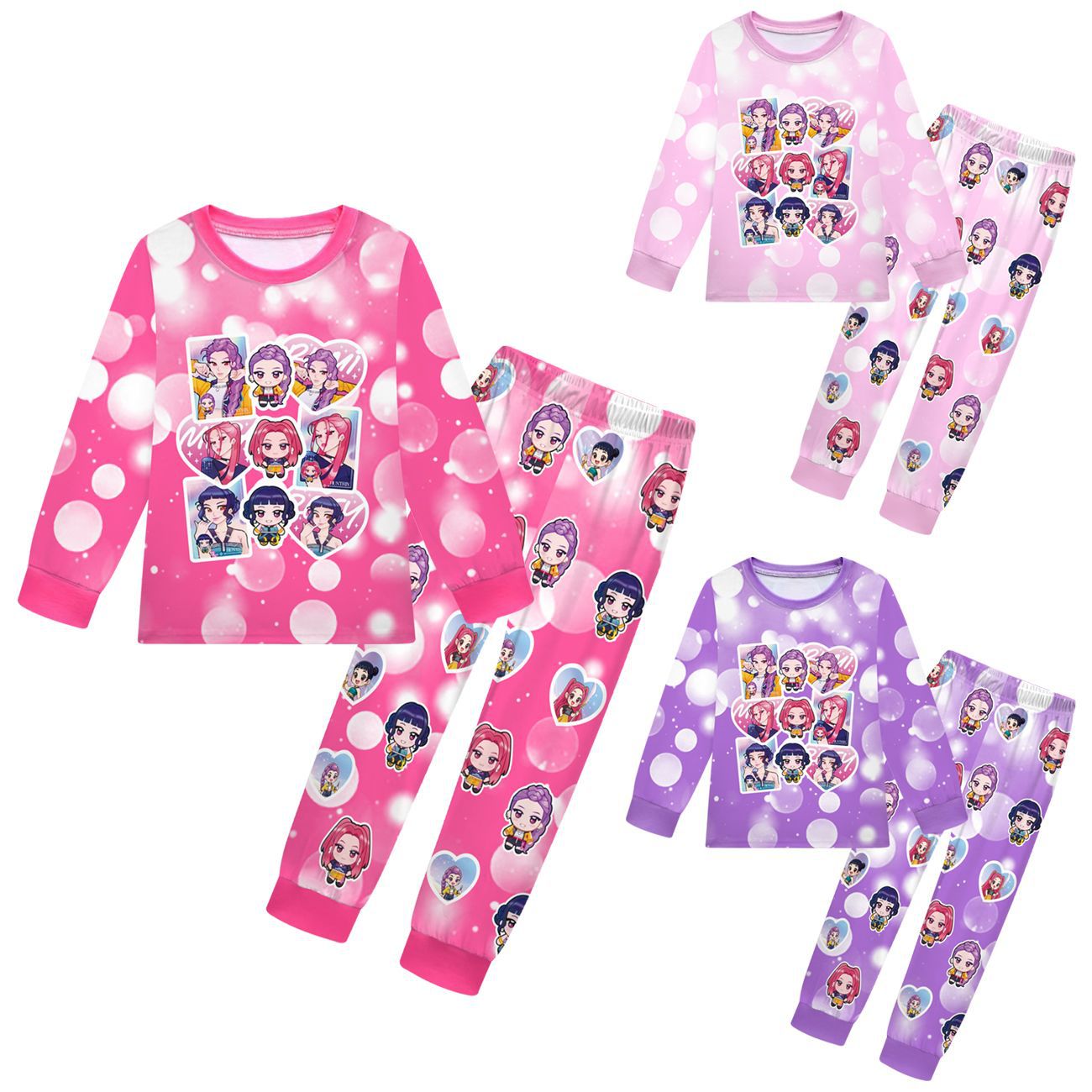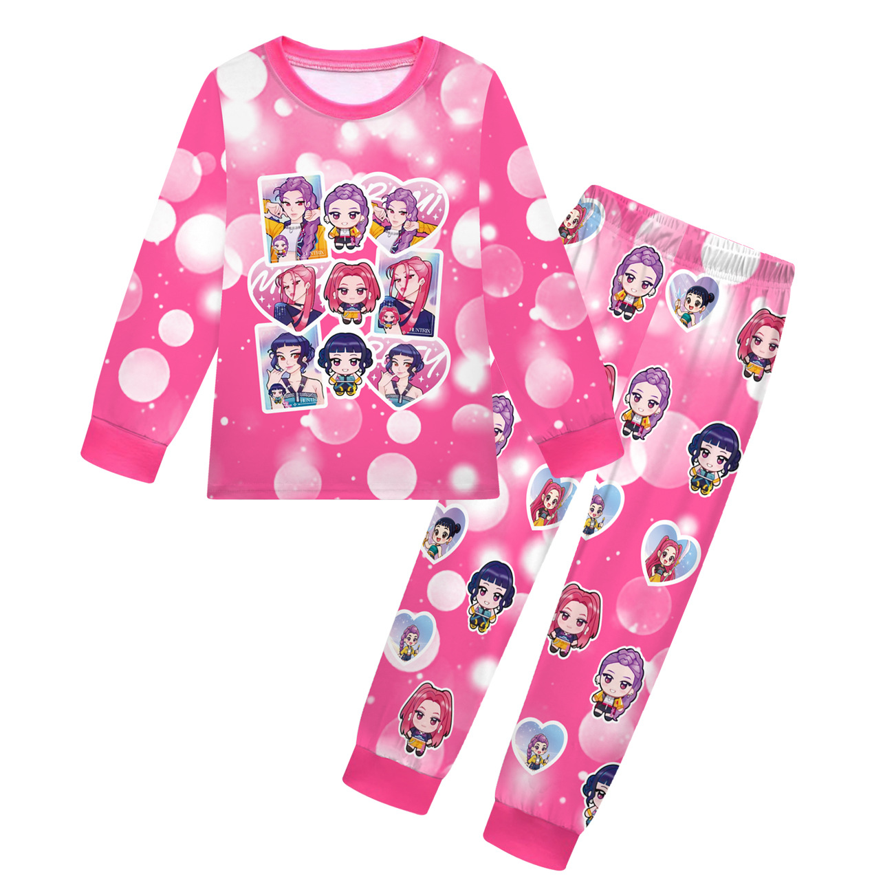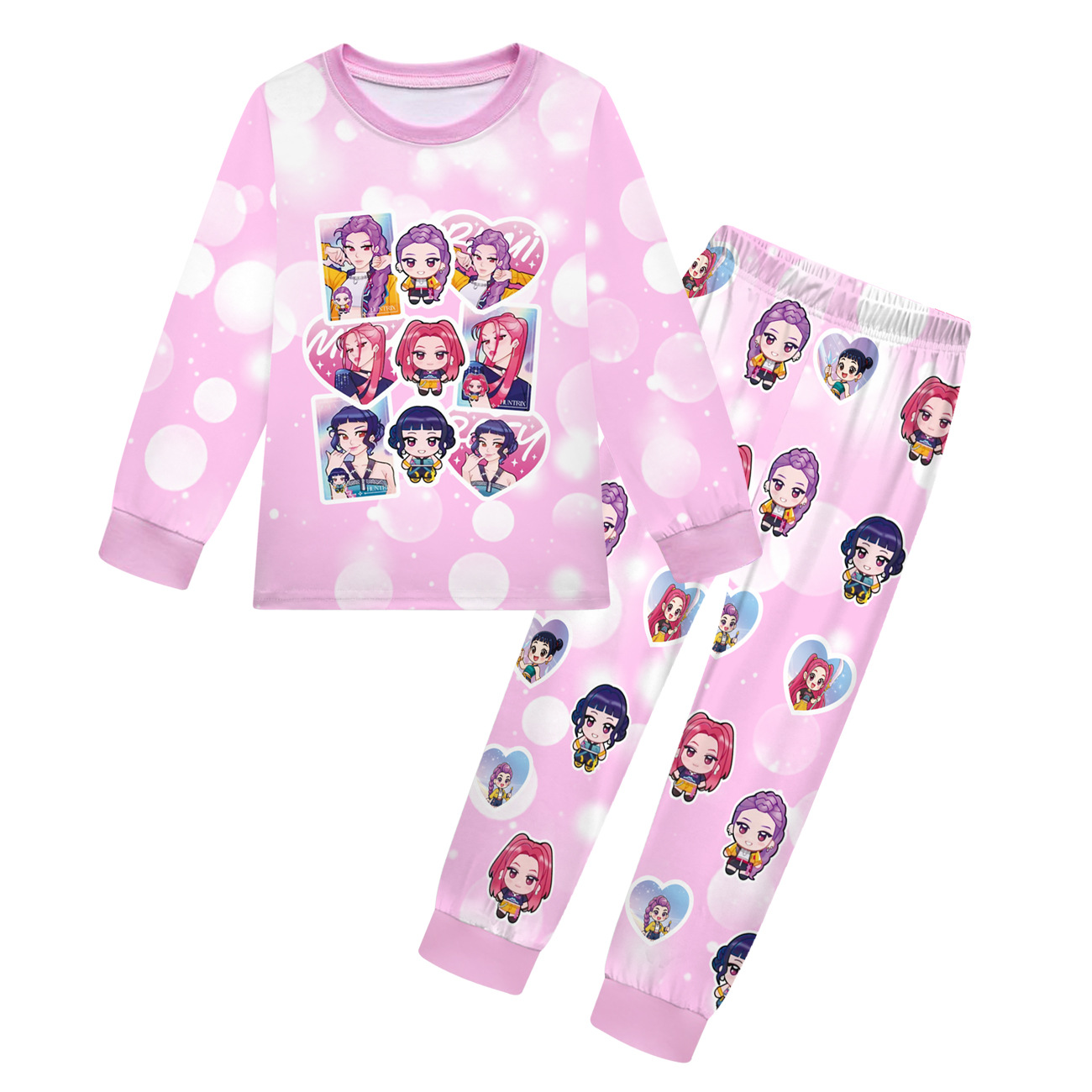 This K-pop Demon Hunter pajamas set is specially designed for girls, featuring an European and American style. It's a two-piece pants set, including a top and pants, perfect as a clothing gift. Suitable for children aged 3 - 8 years old, with heights ranging from 100 - 140cm), and also available in sizes for heights 150cm and 160cm. Ideal for autumn and winter, the set comes with long sleeves and long pants. It's not a hooded design and adopts a pullover closure.